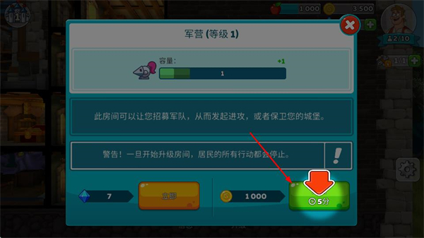1、可花费金币升级军营,升级后能招募更多军队,用于发起进攻或保卫城堡,不过升级期间居民行动会停止。