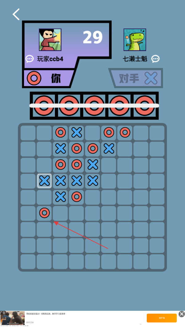 4、若在对战过程中,对手的棋形逐渐占据优势,虽尽力在棋盘不同位置放置圆形符号试图扭转,但最终仍出现失败结算界面,此时可点击“再来一局”重新开始对战。