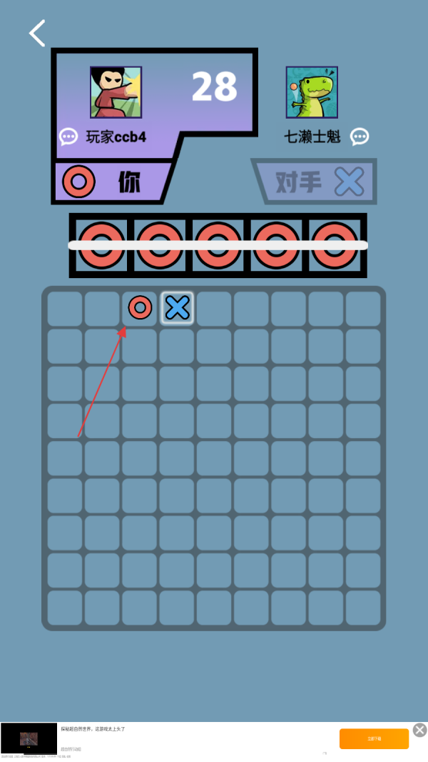1、进入游戏后,查看上方玩家信息与己方符号,己方为圆形符号时,观察棋盘空格,选择合适位置点击放置圆形,以此开启对战布局。