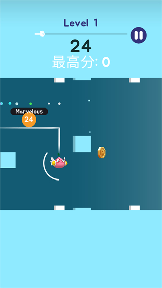 2、进入Level1的游戏场景后,点击屏幕操控角色弹跳移动,收集界面中的金币类道具,以此积累分数推进该关卡的进程。