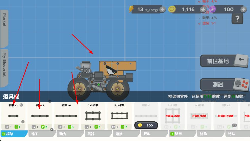 3、在战车建造界面,从道具栏选择框架、轮子等部件组装战车,打造个性化战斗车辆。