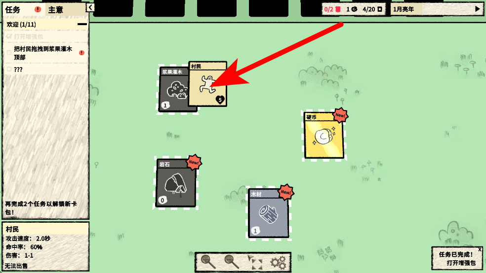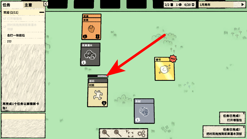 3、在完成任务的过程中,可拖动卡牌移动到指定位置,用村名卡牌连续击打岩石,以此来达成任务目标或触发新的游戏内容。