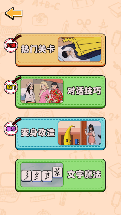 2、点击后进入关卡选择界面,在这里为大家提供热门关卡、对话技巧、变身改造和文字魔法等多个关卡类型,自由选择进入;