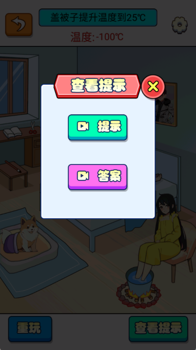 4、进入关卡后,在界面上方会有关卡通关的要求,这一关的要求是,盖被子提升温度到25度;