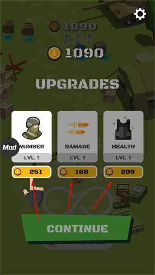 3、完成战斗后,进入升级界面,可花费金币提升NUMBER、DAMAGE、HEALTH、等属性,增强战力。