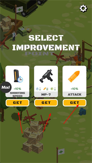 4、还有SELECT IMPROVEMENT界面,能选择获取+10% SHOOTING SPEED、MP-7、+10% ATTACK、等强化项。