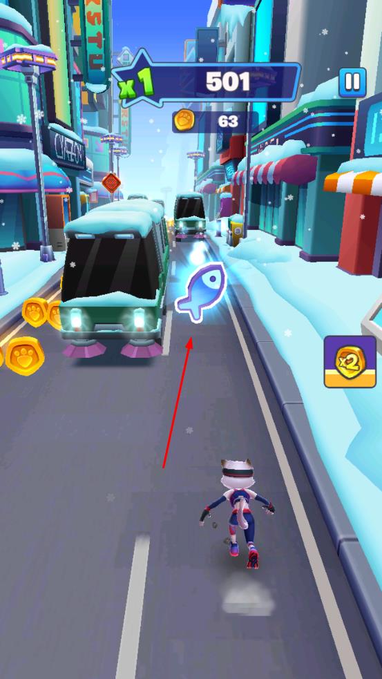 1、在城市街道场景中,操控角色左右移动、向上跳跃,收集金币与蓝色鱼形道具,同时躲避行驶的车辆。