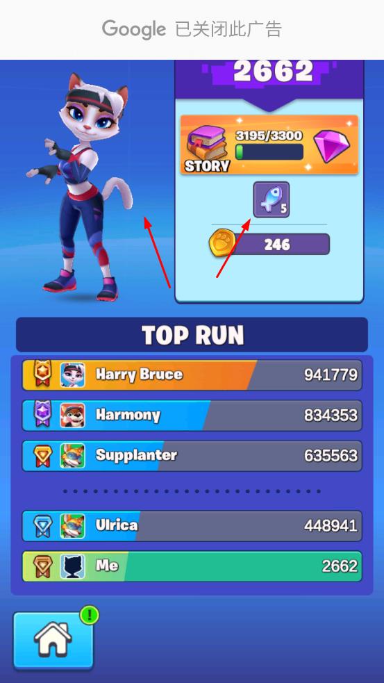 4、跑酷结束后,可查看获得的道具数量、金币奖励,以及故事进度与排名情况,不断挑战提升跑酷成绩。
