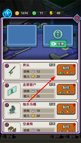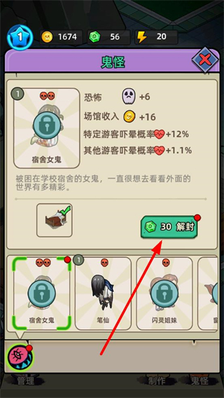 3、找到可解锁的鬼怪,消耗对应资源点击解封按钮,解锁后可提升场馆恐怖值与收益。