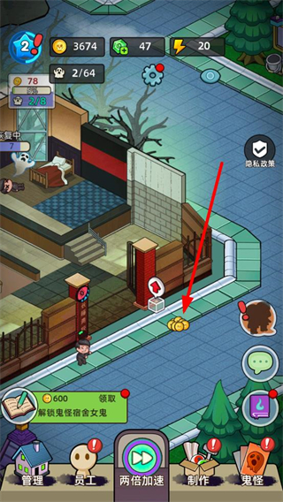 4、解锁鬼怪后,场景会吸引游客进入,游客被吓晕后会产生金币等资源,点击场景中的金币图标可收取资源。