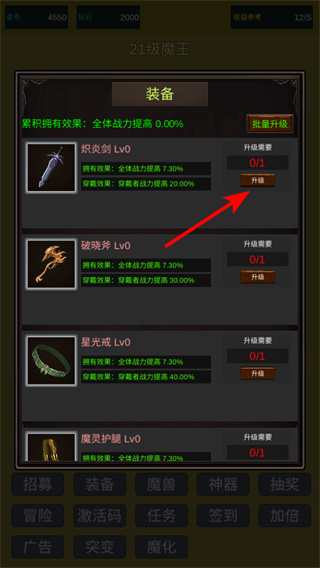 1、在装备界面点击红色箭头指向的烬炎剑旁的升级按钮,消耗对应资源可提升装备等级,获得全体战力穿戴者战力加成。
