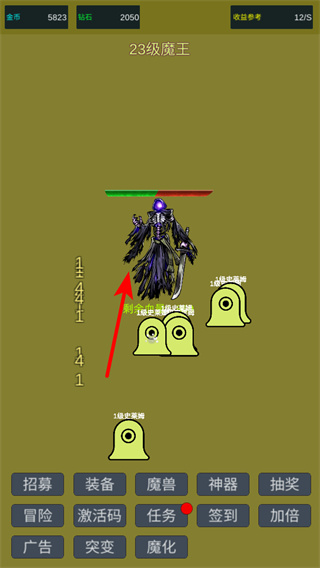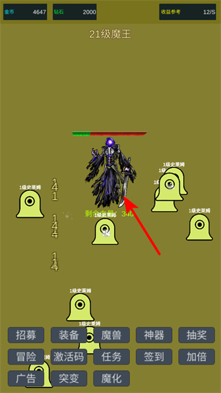 2、游戏中依照红色箭头指引,点击21级魔王的形象区域,可触发史莱姆单位对魔王的攻击,界面会显示当前剩余伤害数值。