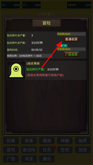 4、按照红色箭头指引,在冒险界面点击普通收获按钮,获取当前钻石碎片总产量对应的钻石资源,累积碎片提升产出效率。