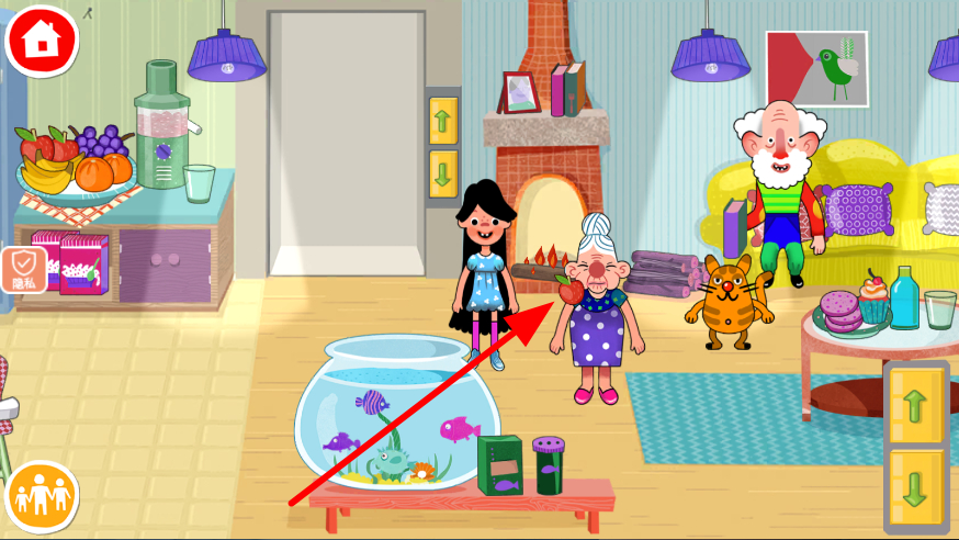 4、拿起桌上的水果,递到老奶奶嘴边,和老奶奶进行分享水果的互动,营造温馨的生活场景氛围,让生活模拟更具趣味性。