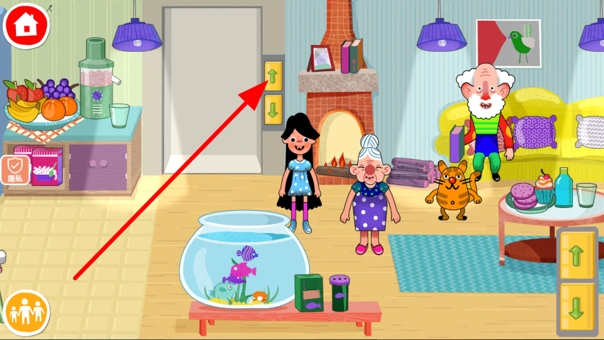 3、留意场景中的功能按钮等元素,如图中的上下箭头按钮,利用这些功能按钮在不同区域间移动,探索更多城堡内容。