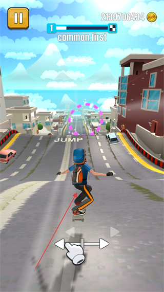 1、操控滑板角色在城市道路滑行,通过左右按键调整方向,准备跳跃。