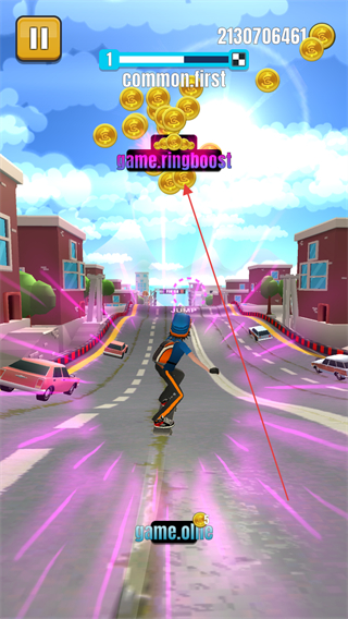 2、穿过粉色圆环触发增益效果,收集大量金币,提升分数。