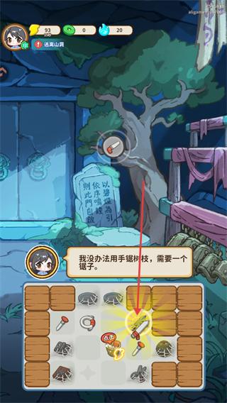 1、在逃离山庙场景中,看到角色给出的游戏提示,点击下方合成栏中的工具箱获取合成工具。
