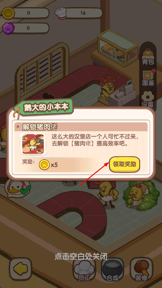 2、完成解锁猪肉佬等任务后,点击领取奖励获取金币等,积累经营资源。