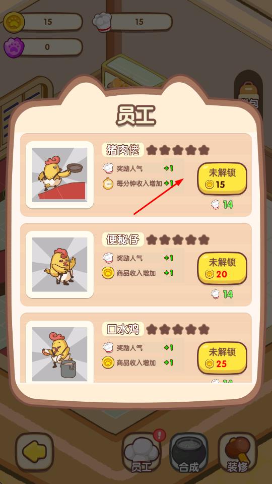 1、在员工界面,花费金币解锁、猪肉佬、便秘仔、口水鸡等员工,这些员工可提升工作效率。