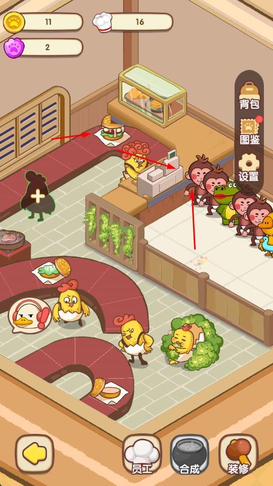 4、店铺内,员工会为排队顾客提供汉堡等食品,通过服务顾客获得金币与经验,推动店铺经营。