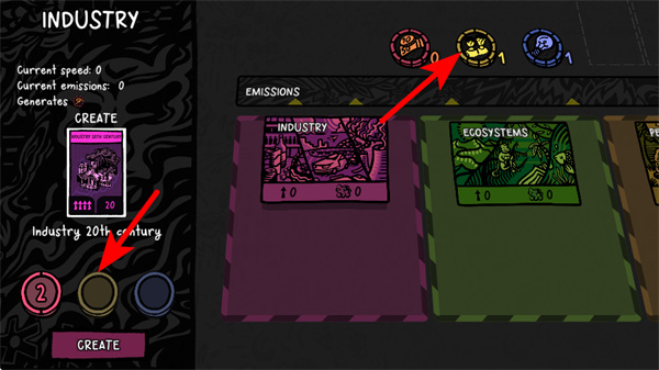4、消耗对应资源红色箭头指向的货币,点CREATE按钮解锁工业卡牌,提升工业板块的资源生成效率,推进游戏的资源建设进度。