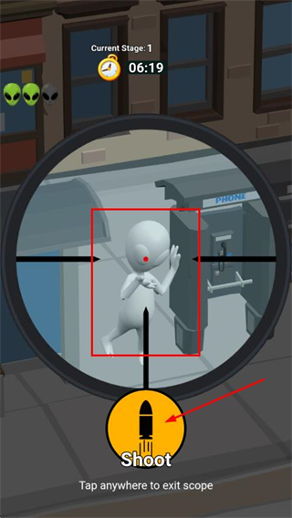 1、在城市场景中,点击瞄准按钮进入狙击视角,仔细观察,寻找外星人的踪迹。