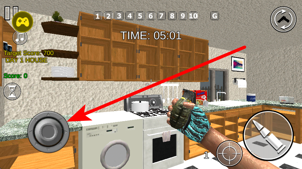 2、在射击场景中,通过左侧的操控按钮,控制角色在场景内的移动方向,让角色能到达合适的射击位置,瞄准目标。