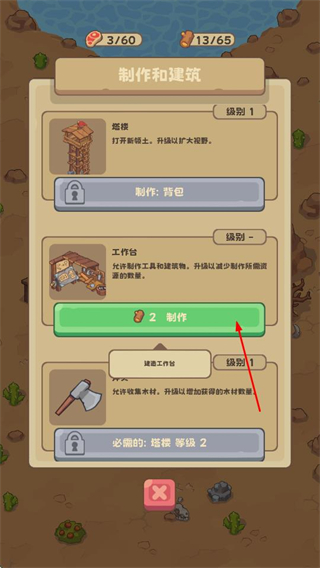 4、打开制作和建筑界面,消耗相应资源制作背包等物品,还能升级塔楼、工作台等建筑,拓展游戏玩法。