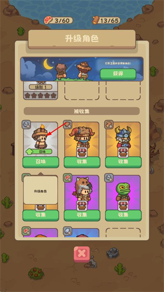 2、进入升级角色界面,可对不同角色进行收集或召唤操作,提升角色相关能力,助力游戏进程。