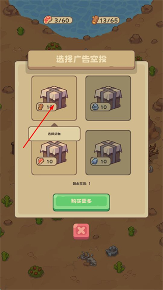 3、在选择广告空投界面,能选择不同的空投箱,获取对应的资源奖励,也可购买更多空投机会。