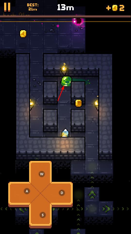 1、通过W、A、S、D键控制角色在像素风格的地牢中移动,探索不同区域。