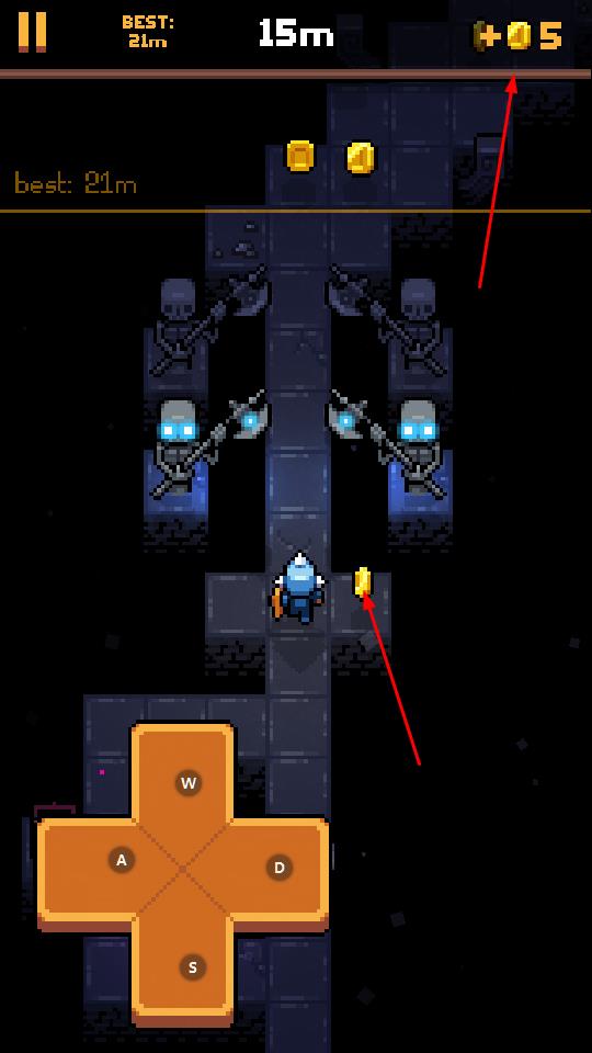 2、在地牢里,收集金币,金币数量会实时增加,同时要留意避开或应对骷髅等敌人。