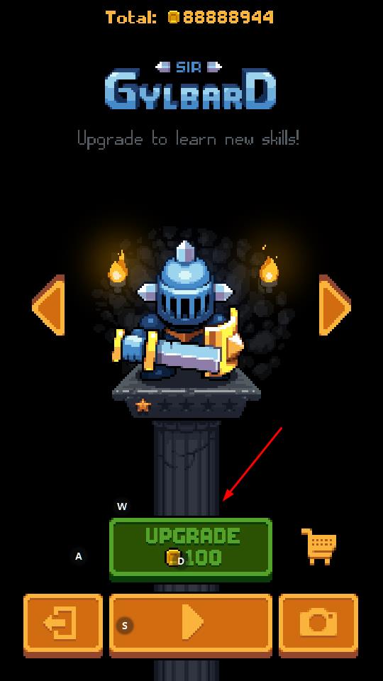 4、积累足够金币后,点击UPGRADE按钮花费100金币升级角色,学习新技能。