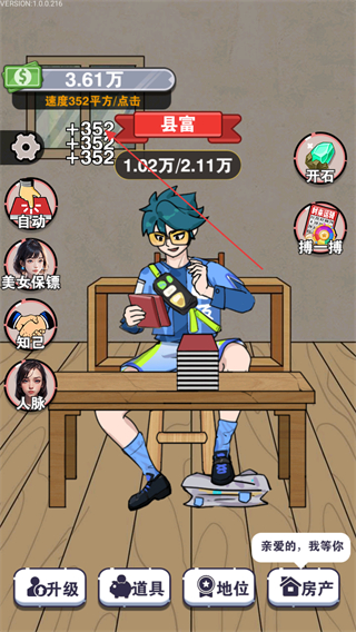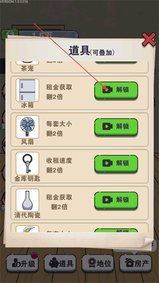 3、点击下方的道具按钮,解锁使用道具增加租金的获取速度,可以叠加使用道具。