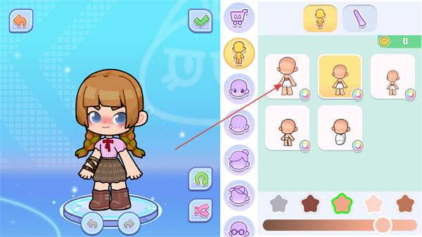 2、点击右侧列表栏选择人偶的人体形象表现和人体肤色的调整。