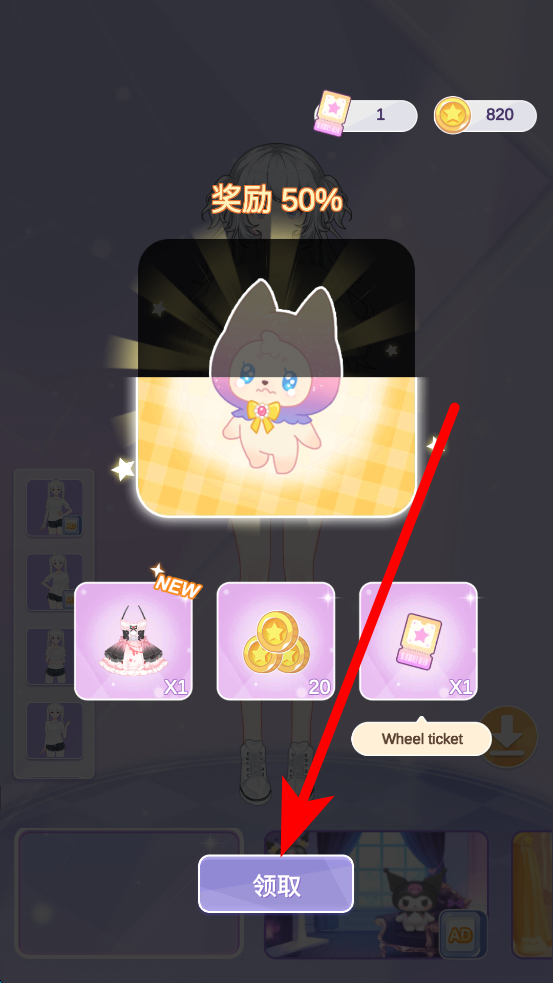 4、游戏中会有奖励发放,当出现奖励界面时,点击领取按钮,就能获取对应的奖励,这些奖励可用于解锁更多装扮元素,丰富装扮选择。