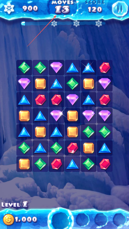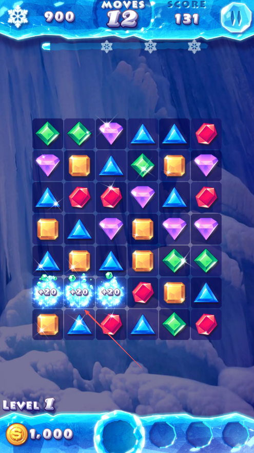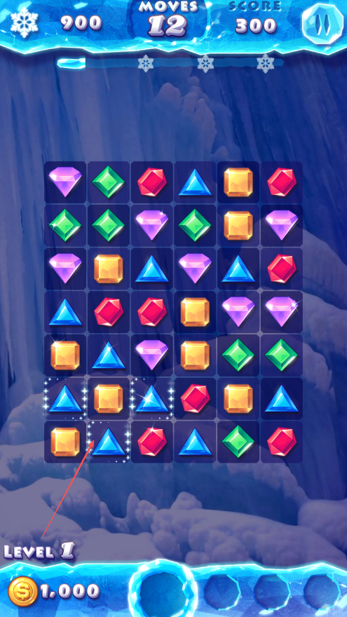 4、不断寻找可消除的宝石组合,完成关卡目标分数,通关进入下一关。