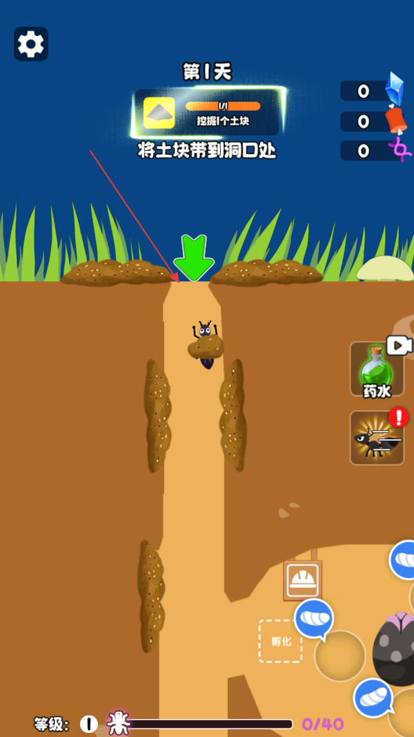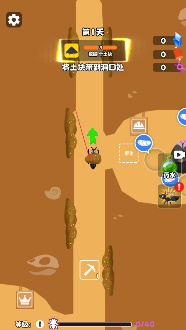 1、找到画面中标注的土块位置,点击屏幕下方的挖掘按钮让蚂蚁开始挖掘土块,待土块变成可搬运状态后,控制蚂蚁叼起土块,将土块放到洞口指定区域。
