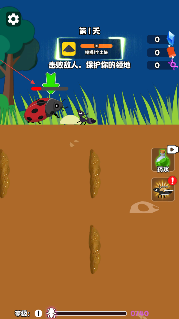 2、当发现画面中出现的瓢虫敌人时,先观察瓢虫的移动轨迹,等待合适时机点击攻击按钮,让蚂蚁对瓢虫发起攻击,过程中注意躲避瓢虫的反击,确保蚂蚁自身血量不会过低。