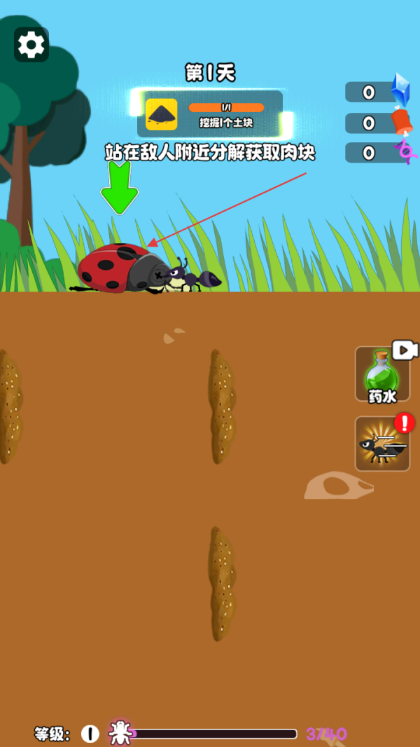 3、点击屏幕上的分解按钮,让蚂蚁对瓢虫尸体进行分解,分解完成后会出现肉块道具,控制蚂蚁叼起肉块,按照画面中箭头指示的方向,将肉块送到蚂蚁巢穴的储存区域。