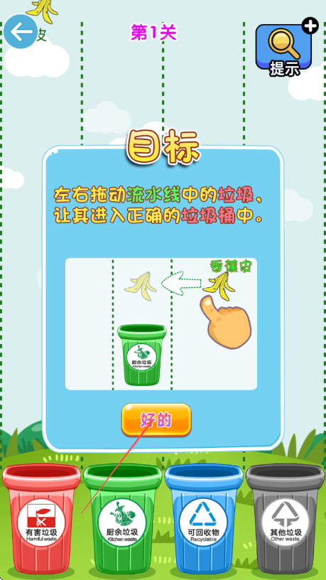 1、查看目标提示,左右拖动流水线上的垃圾,将香蕉皮拖入绿色厨余垃圾桶。