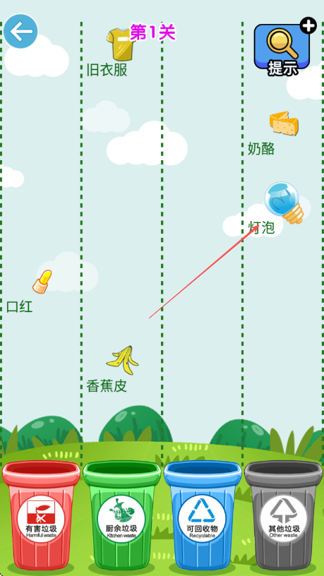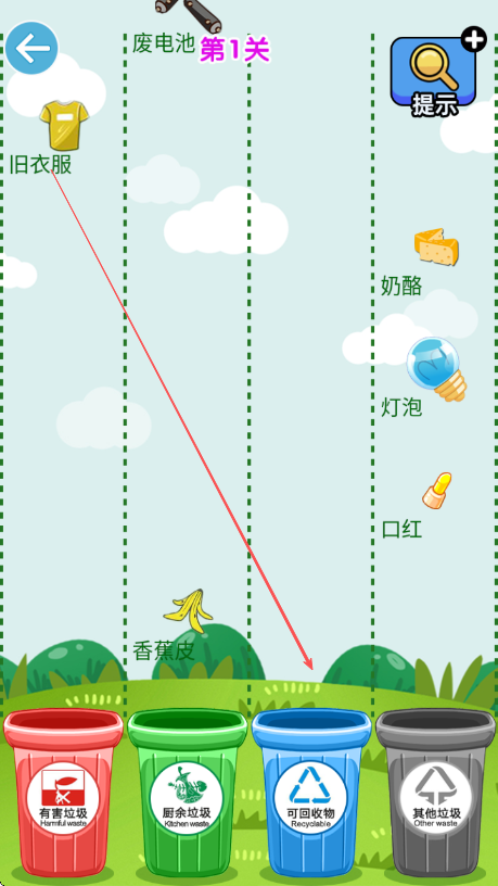 3、判断垃圾类别,将蓝色灯泡拖到有害垃圾桶,其他垃圾对应投放。