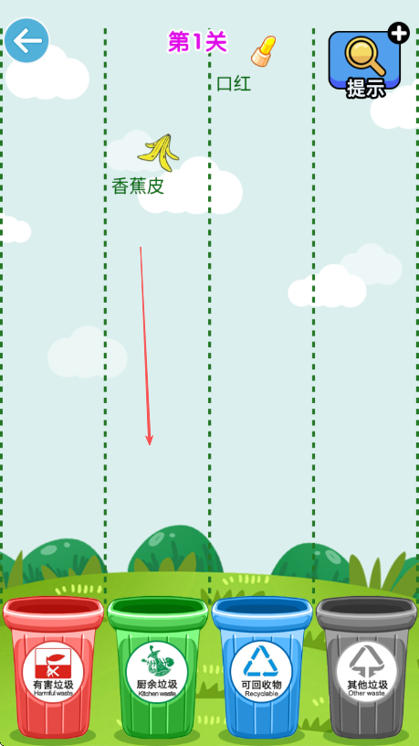 2、识别垃圾,把香蕉皮拖进绿色厨余垃圾桶,口红对应正确垃圾桶。