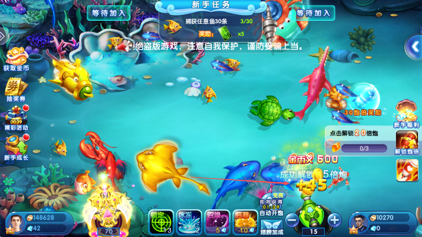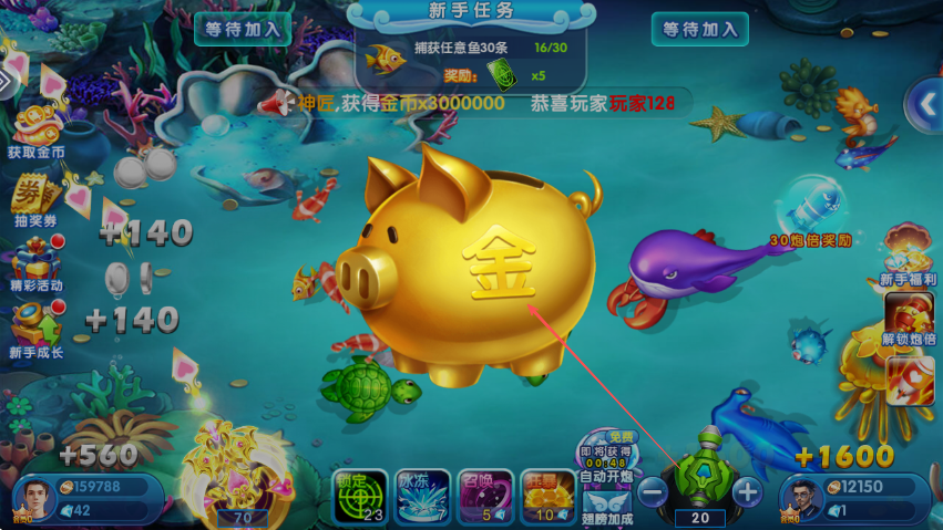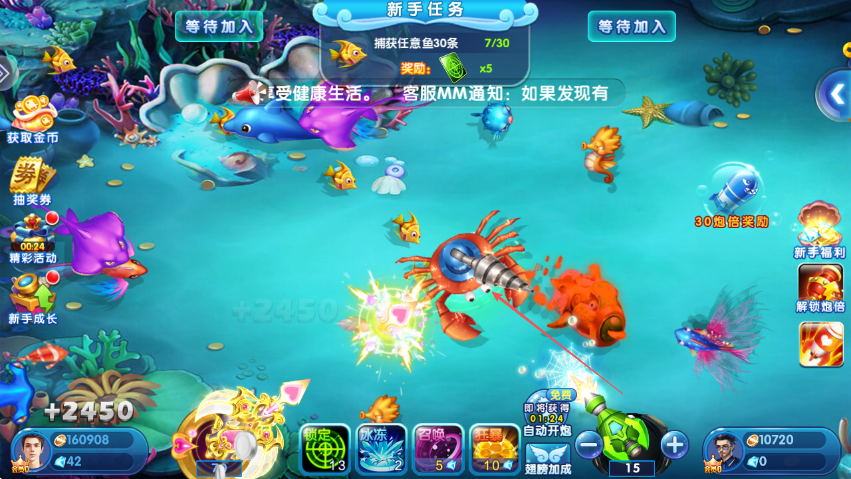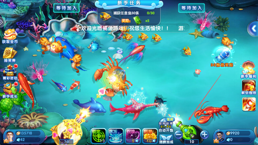 1、进入游戏后,留意新手任务,初始任务是捕获任意鱼30条,明确目标开始捕鱼。