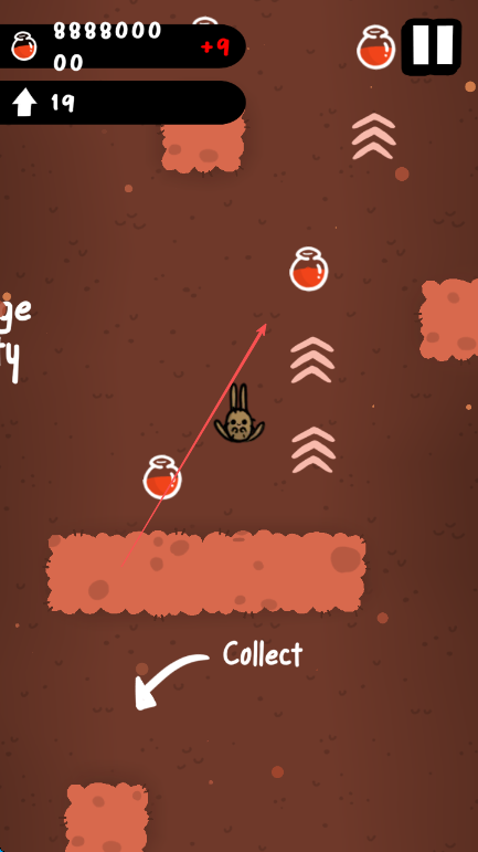 2、利用屏幕右侧箭头图标操控角色跳跃,躲避障碍物,继续收集药剂瓶,增加分数,推进游戏进程。