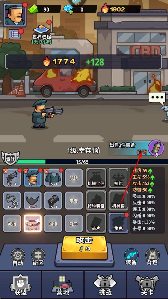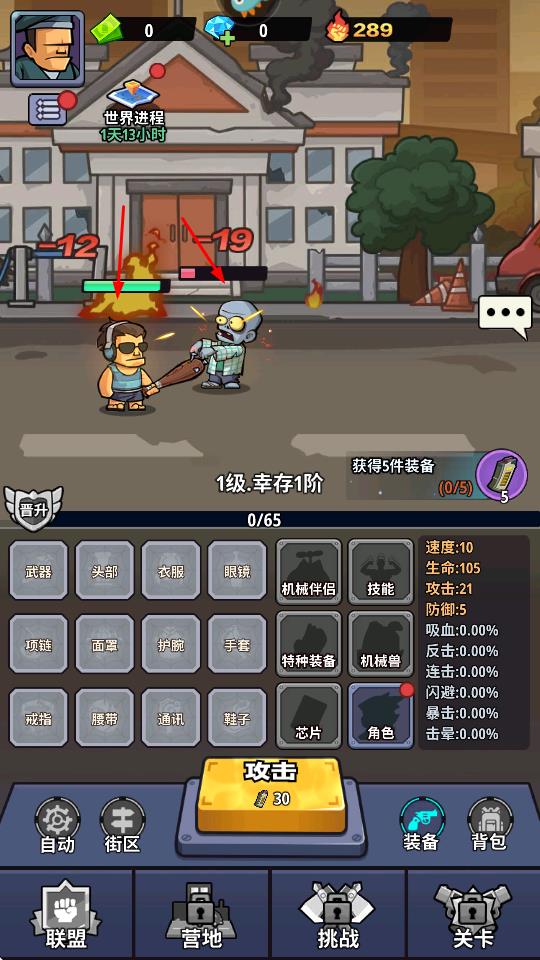 1、操控角色与丧尸战斗,通过点击攻击按钮等方式,对丧尸造成伤害,获取战斗经验和装备。