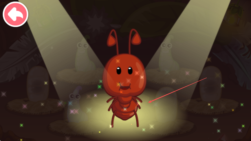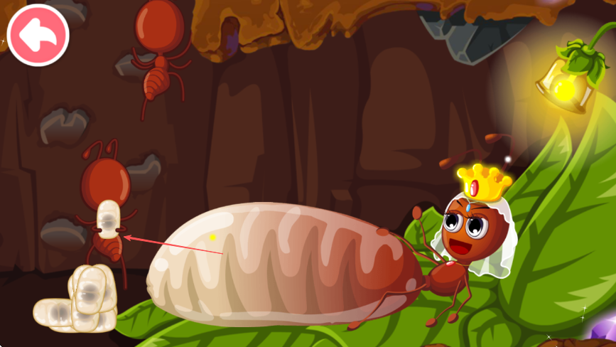3、若虫茧中孵化出蚂蚁,会有聚光灯效果展示,认识不同形态的蚂蚁。