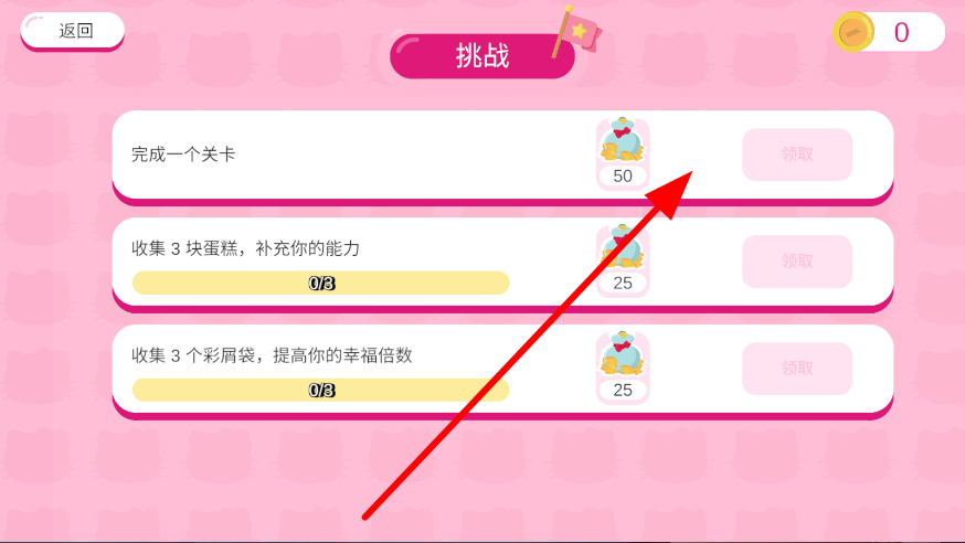 1、挑战界面,有不同任务,收集蛋糕、彩屑袋等,完成任务可领取奖励,这些奖励能用于后续角色能力升级等,推动旅行进程。