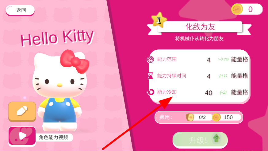 3、角色界面能查看凯蒂猫的能力,像能力范围、持续时间、冷却等,还可消耗资源升级能力,提升旅行中的表现,更好应对情况。